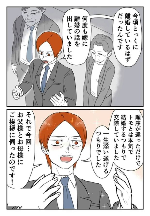 突然、訪ねて来た、モトさんと両親。モトさんは、「自分が独身と偽って、尾持さんと交際していた」と、尾持さんの両親に告げます。出会う順序がちがっただけで、深く尾持さんのことを愛していると言うのです。