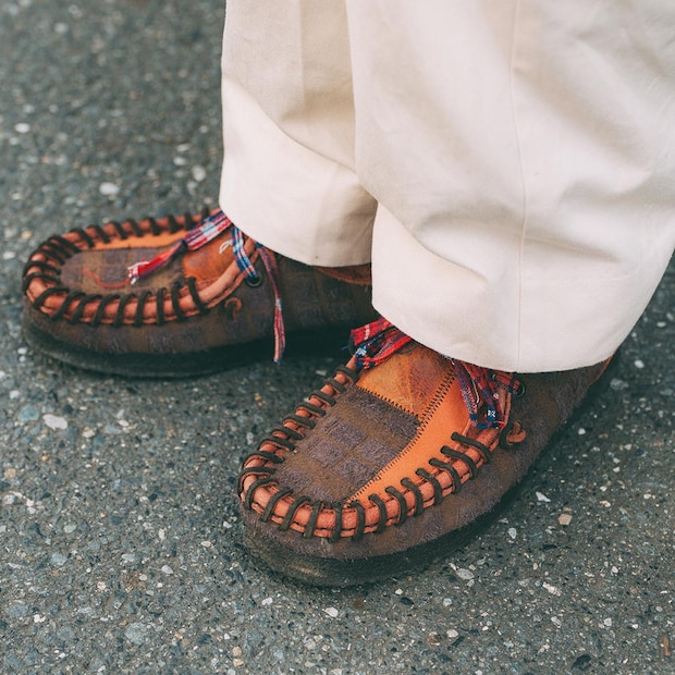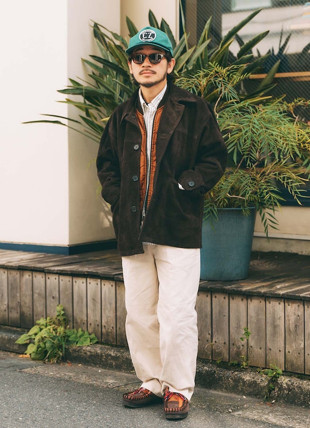 スエードシューズでこなれ感抜群の足元にアップデート! バイカラーパンツを引き締める役割も。