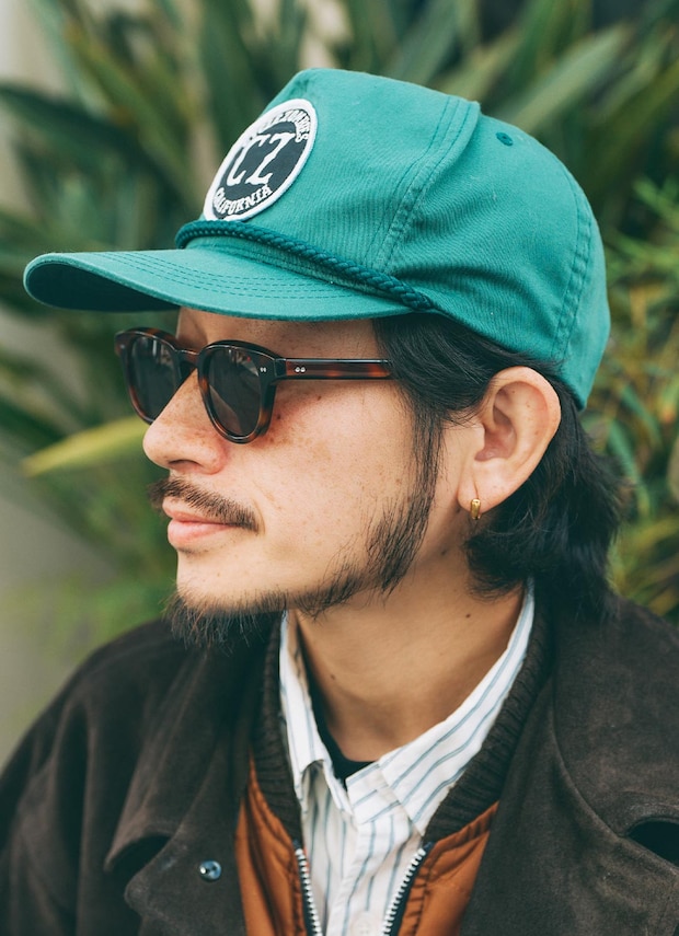 鮮やかなグリーンのキャップをキャッチ!べっ甲柄のサングラスで、緊張感を加えたバランス感はお見事。
