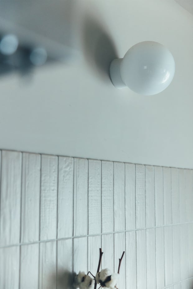 キッチンのブランケットライトは〈toolbox〉のミルクガラス製をチョイス。「壁付けの照明はあとからつけられないので、慎重に考えながらレンジフードを挟んで対称に配置しました」(木綿さん)