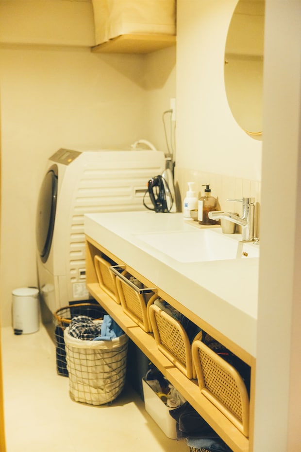 洗面台収納のサイズを決めた〈TOU〉のバスケット。「家を購入する前から気になっていたアイテムで、このバスケットが4つぴったりに収まるサイズで洗面台をつくってもらいました」(木綿さん)