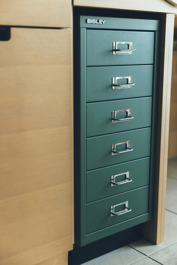 造作キッチンにぴったり収まるようにスペースを確保した〈BISLEY〉のキャビネットが、岳さんのワークスペースとの境目。引き出しのラインまで揃う美しさは圧巻。