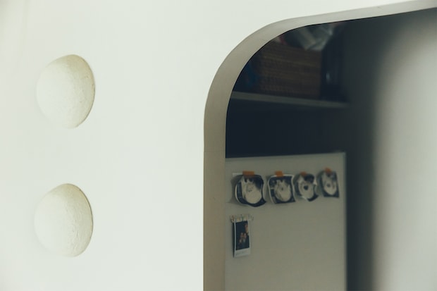 キッチンは家電を極力隠すことを意識し、小さなパントリーの奥に冷蔵庫を配置。ここにも曲線デザインが加わることで、やさしい空気が流れる。粘土屋・陶芸家として活躍する日置哲也さんのウォールピースが、もともとそこにいたかのように空間に馴染む。