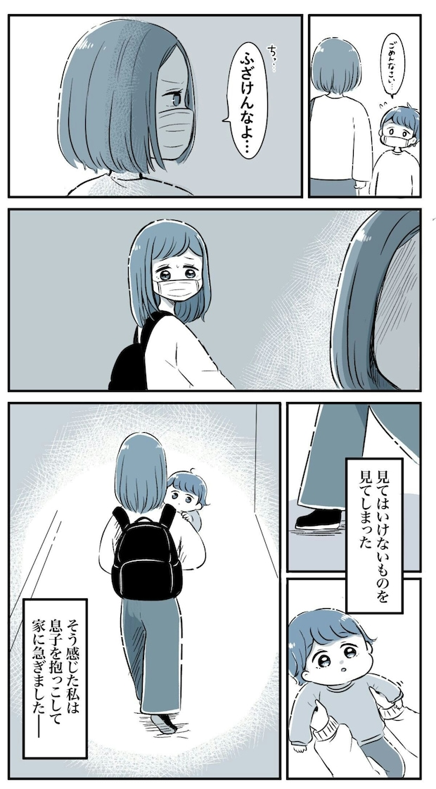 これはあるママの体験をもとにしたお話です。主人公のママは最近引っ越してきた中野家とはあいさつをする程度の仲でした。幸せそうな5人家族に見えていたのですが、ある日、道ですれ違ったとき耳にした中野家の母親の声に、ドキッとします。