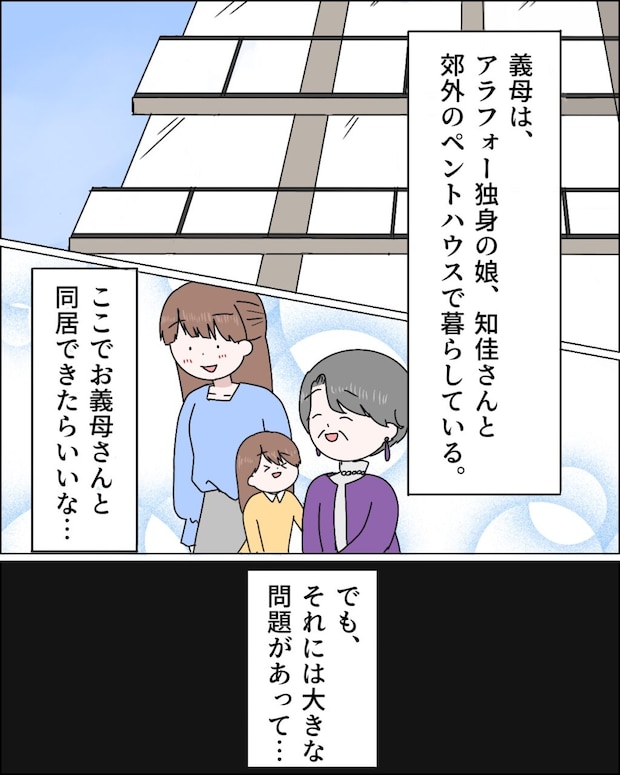 義実家は郊外の高級マンションの最上階。アラフォー独身の娘、知佳さんとこの豪華なペントハウスで暮らしています。そろそろマイホームが欲しいと思っている私は、遊びに来るたびにこんな素敵な家で義母と同居できたらどんなに素敵だろうと淡い夢を抱いていました。