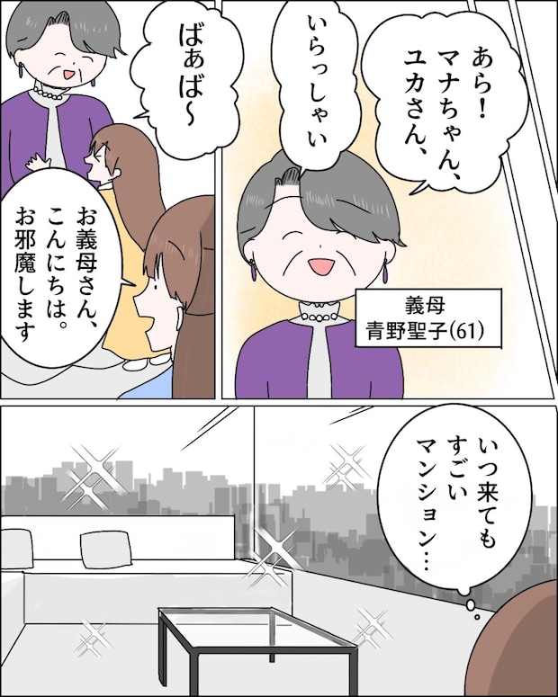 義母の家に着くと、いつものように笑顔で出迎えてくれました。義母はいつも素敵な装いで、きれいにお化粧をしていて、品のある女性です。マナは可愛がってくれるばあばが大好き。そして、いつ来ても義母の家はすごいマンションです。まるで自分がセレブにでもなった気分でテンションが上がります。