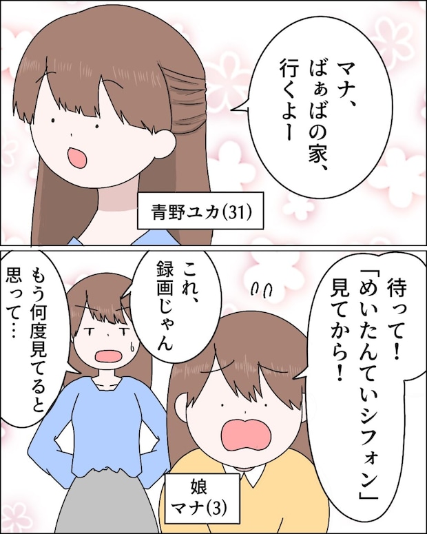 義母の家に遊びに行くことになってるこの日。出発時間になっても娘マナは、大好きなアニメ「名探偵シフォン」を見てからと行くと言ってテレビの前から離れません。義実家に持って行くお菓子も用意したし、昼前には着きたくて準備万端なのに、録画で何度も見ているアニメをいったん再生してしまうともう何を言ってもムダなのは私にもわかっていました。仕方なくテレビの前に行った私は。