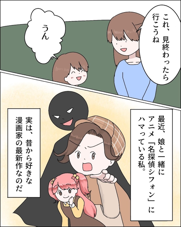娘と一緒にハマっているアニメ「名探偵シフォン」は、実は私が昔から大好きな漫画家の最新作なのです。アニメ化されると知ったときは大興奮でした。娘に負けないくらい、私も何度見ていることか。もちろん原作漫画は全巻持っていますし、学生の頃から読んでいる他の作品も全て揃えて実家に保管しているのです。結局、最後まで一緒に見てから義母の家に行くことにしました。