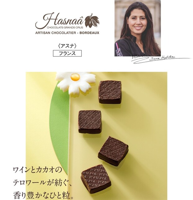 モデル、会社員の経歴をもつアスナ・フェレラ氏によるブランド。ボルドー産ワインの澱を使用したショコラの限定アソートを販売する。