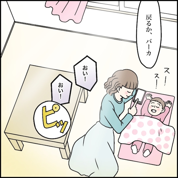 「戻るか、バーカ」と言い捨て、「おい!おい!」タカシが引き留めようとするのも無視して電話を切ったのでした。その横でモモはすやすやと眠っていました。