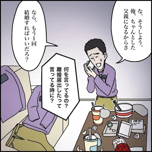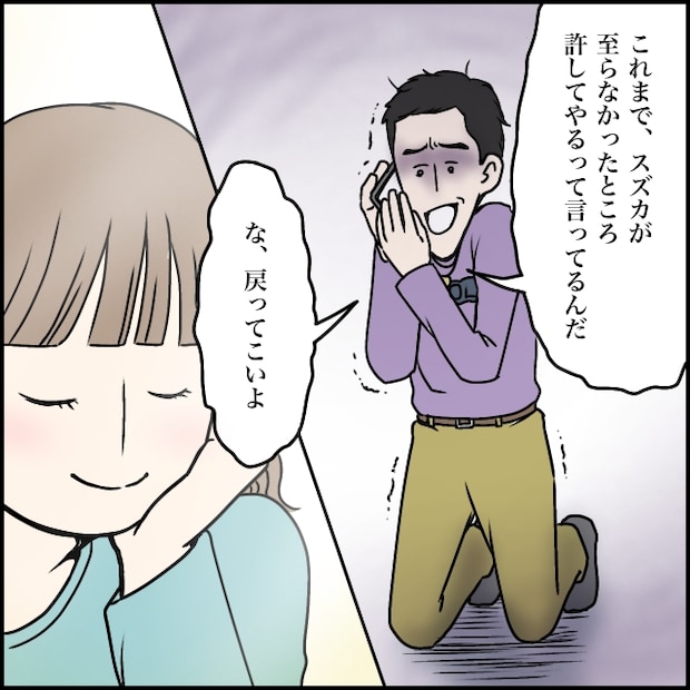 気に入らないことがあるとすぐ「離婚」と口にする夫タカシさんの言葉を受け流してきたスズカさん。彼女より友達を優先し「嫌なら別れる?」と面倒くさそうに突き放したかと思うと「じゃあ結婚する?」とスズカさんは振り回されてばかり。入籍後、一生懸命に尽くすもタカシさんはやっぱり変わらず、スズカさんが不安になると「じゃあ子ども作る?」と提案するタカシさん。そんなある日、スズカさんが高熱を出すと「うつされると嫌だから」とスズカさんを置き去りに。数日後、今度はタカシさんが「熱っぽい」と重病人のように振る舞い、スズカさんが気遣って看病食のうどんを作ると具が卵だけだと怒り出し水を持って来いと指示。敢えて常温の水を渡すと突然頭から水をかけられて驚くスズカさん。「離婚しよ。お前なんかいらねーわ」と酷い言葉を吐かれて静かに部屋を出ました。数日後、帰って来ないスズカさんにタカシさんがお詫びのメッセージを送るも既読にならず。その後、アツヤさんに呼び出され結婚と妊娠の報告をされた上に「飲み会を優先する人が、まともな父親になれるとは思わない」と言われ立場のないタカシさん。家に帰るとスズカさんはおらず、代わりに「離婚届提出しました」とスズカさんからメッセージが。どういうことだと電話すると、以前投げつけられた離婚届を提出したと言われ青ざめるタカシさん。「タカシがいない方が幸せになれると思う」と清々しい表情で言うスズカさんを、タカシさんは必死に引き留めようとしました。