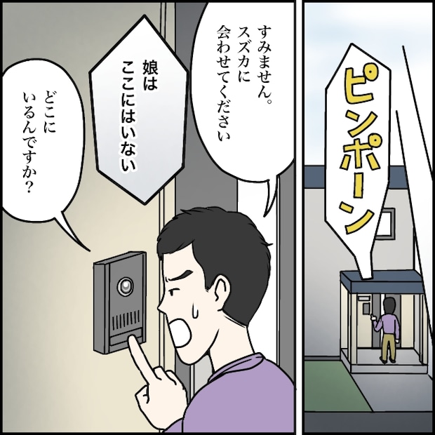 「すみません。スズカに会わせてください」と言うタカシの言葉に、「娘はここにはいない」と素っ気なく答える両親の声。「どこにいるんですか?」とタカシは引き下がらずに話を続けました。