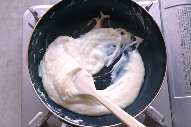 残りの牛乳を2回に分けて加え、ヘラでかき混ぜながら弱火で温めます。