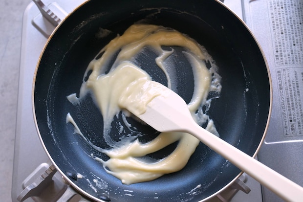 もったりした状態になり、ヘラですくったあとが消えずにフライパンの底が見えたままになればOK。