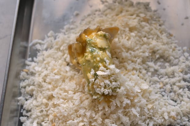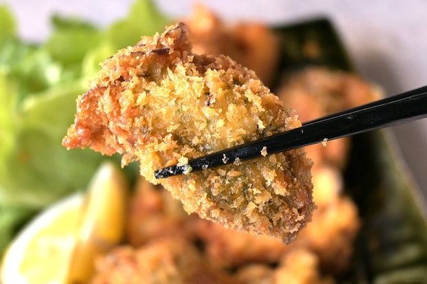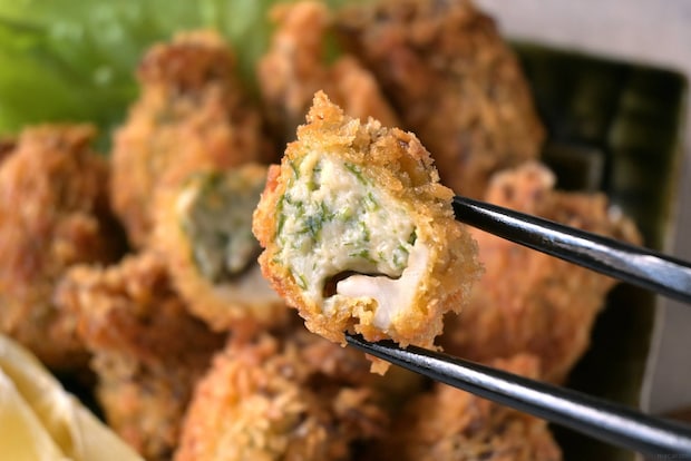 できあがりの見た目がこちら。ほぼ「カキフライ」と言ってよいほどの再現度ではありませんか?サクサクの衣を噛みしめると、中からまいたけの弾力ある食感が。これが牡蠣の身のプリッとした歯ごたえに驚くほど似ています。