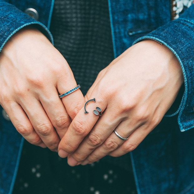 きらめくブルーやにっこりフェイスのリングで遊び心をオン。 シルバーにまとめて統一感を演出、デニムジャケットとも相性抜群!