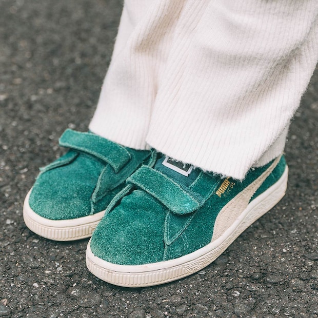 冴えるグリーンの『プーマ』スニーカーが挿し色役に抜擢! スウェード素材とベルクロデザインがヴィンテージ感漂うアイテム。