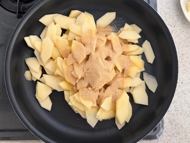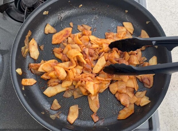 2. 1のりんごをフライパンで、きび砂糖Aと一緒に汁気がなくなるまで煮詰める。煮詰まったら火を止め、シナモンパウダーとバターをからめておく。