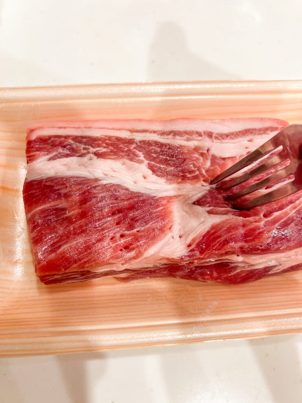 まず、フォークでお肉に穴をあけます。