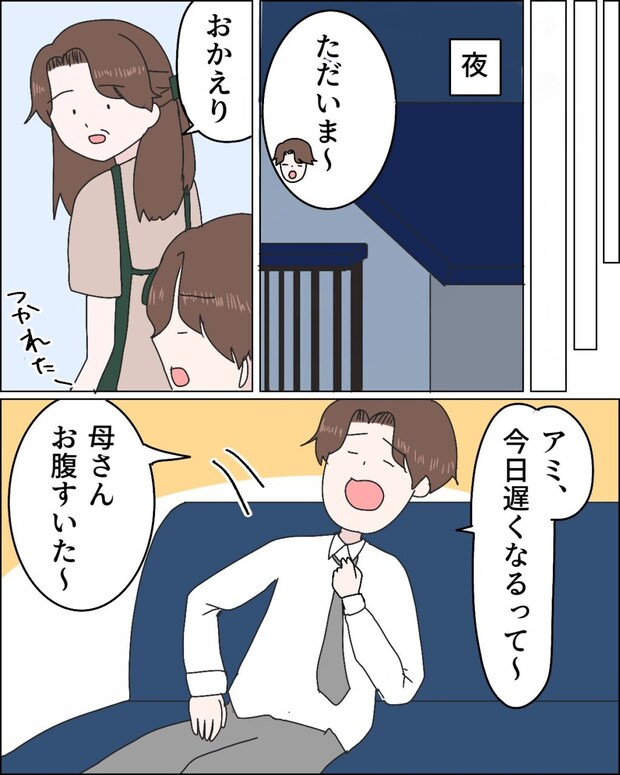 夜、ショウが会社から帰ってきてもまだ出かけたまま戻らないアミちゃん。するとショウが「アミ、今日遅くなるって~。母さん、お腹空いた~。」と言いました。