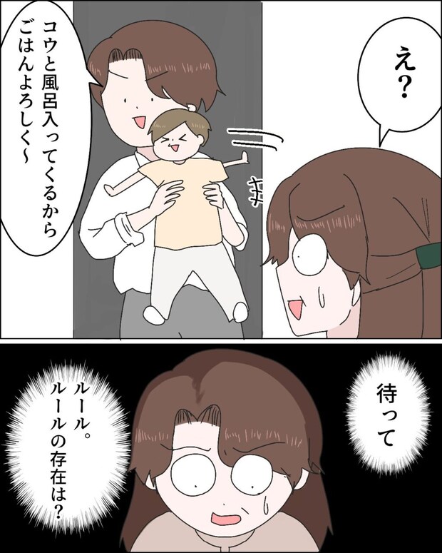 「え?」目を丸くする私にお構いなしで、ショウはコウを抱きかかえると「コウと風呂入ってくるからご飯よろしく~」と言うと、サッサとお風呂に入ってしまいました。待って、ルール。ルールの存在は?息子夫婦の自由気ままな行いに唖然とする私です。
