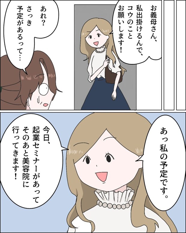 サッサと朝食を食べて部屋に戻ったアミちゃんは、バッチリお化粧をして現れると「お義母さん、私出かけるんで、コウのことよろしくお願いします。」と言って一人で出かけるようです。え、そんなこと聞いてない!と思った私は慌てて「さっき予定があるって・・・」と言うと、「あっ、私の予定です。今日、起業セミナーがあって、そのあと美容院に行ってきます!」と当然のように言うアミちゃん。耳を疑いました。