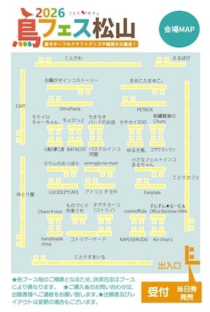 「鳥フェス松山2026」は、全国から人気クリエイターが集合し、色とりどりの小鳥モチーフの作品やグッズなどを対面販売するイベント。広い会場に所狭しと鳥をテーマにしたクラフトグッズや雑貨、ハンドメイド作品、小鳥のおもちゃやフードなどが大集合。用品メーカーのCAP!(ドリームバード)が、小鳥のごはんや飼育用品も販売い、愛鳥へのお土産選びも楽しめる。