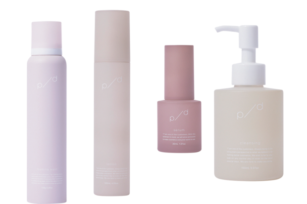 中山さんのイチオシは美容液。「パッケージもシンプルで、ギフトにもいいですよね」。左から:泡洗顔¥3,960、ローション¥4,730、美容液¥7,700、ジェルオイルクレンジング¥3,960※全て予定価格(全てp/d/PDS Life) 問https://pd-cosme.com/