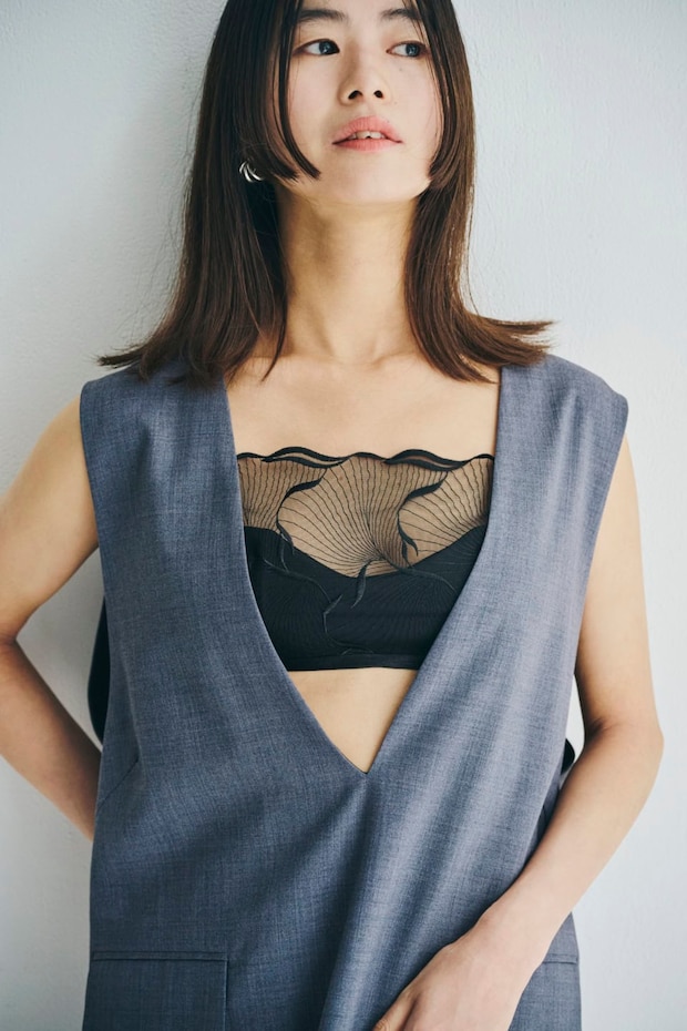 F:もはやお洋服のようですよね。フロントが深く開いているお洋服には、タンクトップやビスチェライクなものを取り入れてみてはいかがでしょうか?