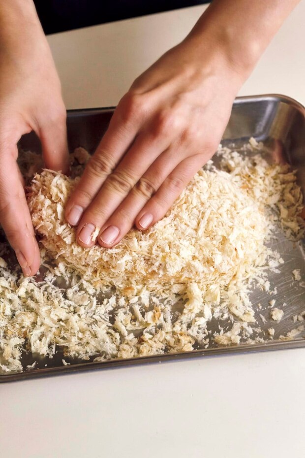 パン粉は豚肉が見えないくらいたっぷりとのせ、肉をつぶさないよう、形に沿うようにして両手でギュッとまぶすことで、カリッと仕上がります。