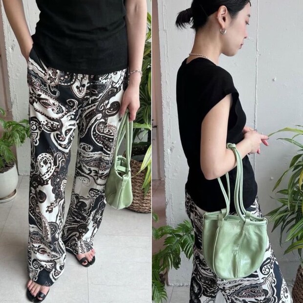 「存在感のあるペイズリー柄のパンツはセンタープレス入りでカジュアル過ぎずないところがポイント。ミントグリーンのバッグはヘリューのもの。シックなモノトーンスタイルを大人可愛いムードにしてくれます」CINOHのパンツ、HEREUのバッグは本人私物