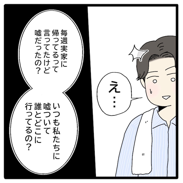 私の話を聞いて、正志は明らかに動揺していました。「え・・・」と言葉に詰まり、立ち尽くす正志に「毎週実家に帰ってるって言ってたけど嘘だったの?いつも私たちに嘘ついて誰とどこに行ってるの?」と、私は直球で気になっていたことを問いただしました。