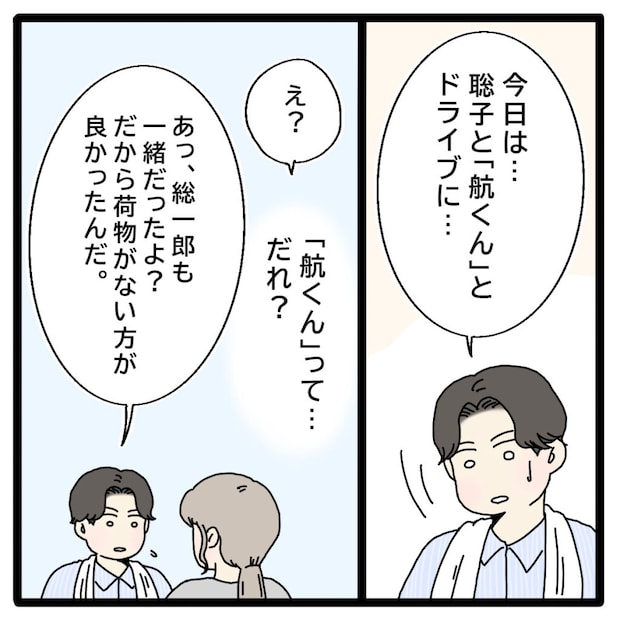 正志は私から目をそらしたまま、予想はしていたけれど聞きたくなかった名前を口にしました。聡子さん・・・。正志は、聡子さんと航くんとドライブに行っていたと白状しました。娘のリマを放っておいて、ドライブ!?しかも初めて聞く航くんという名前もあり、私が思わず「え?」と聞き返すと、正志は慌てて総一郎さんも一緒だったと釈明しました。みんな一緒にドライブしていたから、荷物がない方が良かったと言うのです。リンゴのことなんて知らなかったくせに。正志への信頼が薄れていきました。