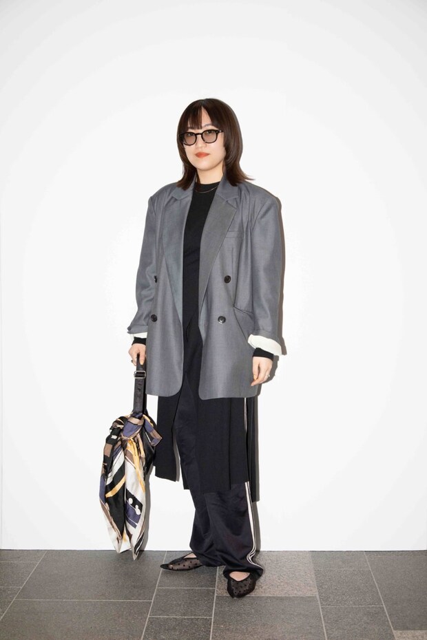 同僚と遊びに来ていたSeaRoomlynnプレス 増田帆波さんは、今季大注目のトラックパンツをアクセントに効かせたスタイリングを披露。オーバーサイズのジャケットとデザイン性のあるインナー、さらにはクールなモノトーンでまとめることで、スポーティでクセの強いアイテムをモードに昇華させています。シースルーのドットパンプスやバッグに巻いた大判のスカーフなど、コーデに動きと抜け感をもたらす小物のセレクトも秀逸!