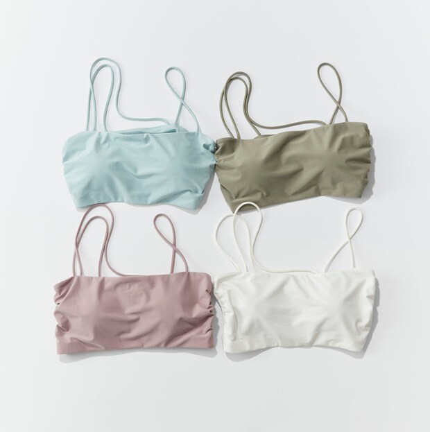 華奢なストラップがデコルテに斜めに入るこだわりのデザイン。適度なフィット感が心地よい「STRESS FREE FABRIC」生地を使用。吸水速乾、接触冷感性、UVケア機能付き。サウナでの着用を見越して、熱くならないよう金具は不使用という心遣いがニクイ! バンドゥブラ各¥12,100(全てMIZUKI HANAYAMA×NAVE)