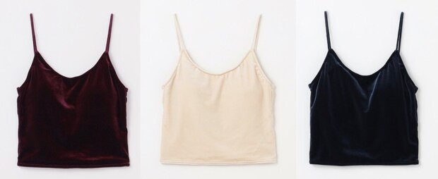上品な光沢感と高い伸縮性が特徴のストレッチベロアを使用したキャミトップスは、ビーチウェアとしてはもちろん、普段づかいにもオススメ。コンパクトな丈感でどんなボトムとも好相性。アメスリキャミトップス各¥15,400(全てMIZUKI HANAYAMA×NAVE)
