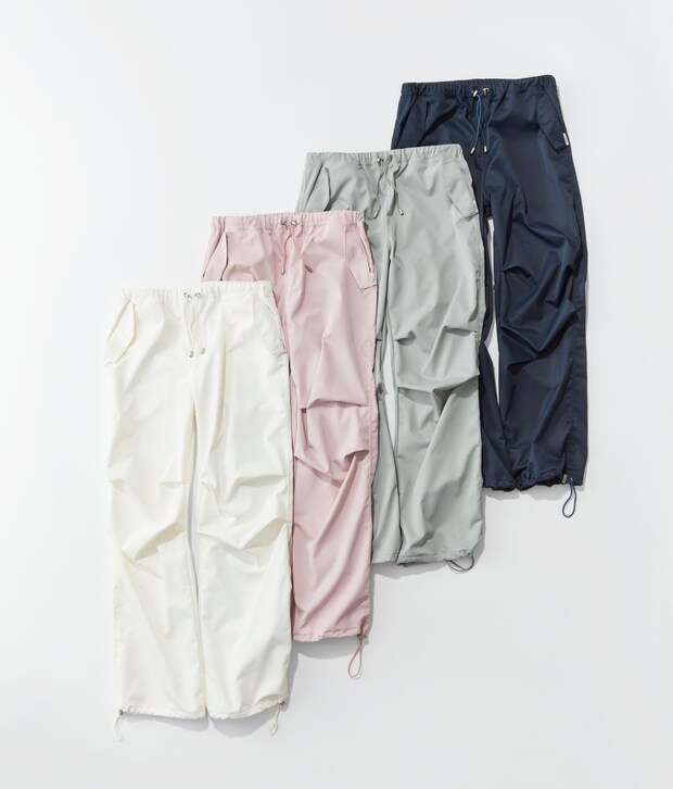 ユーティリティウェアが旬の今、UVケア、透け防止、撥水、ストレッチなどたっぷり機能を盛り込んだパラシュートパンツはぜひ手に入れたい1本。夏でも軽やかなはき心地を叶えます。パラシュートパンツ各¥17,600(全てMIZUKI HANAYAMA×NAVE)