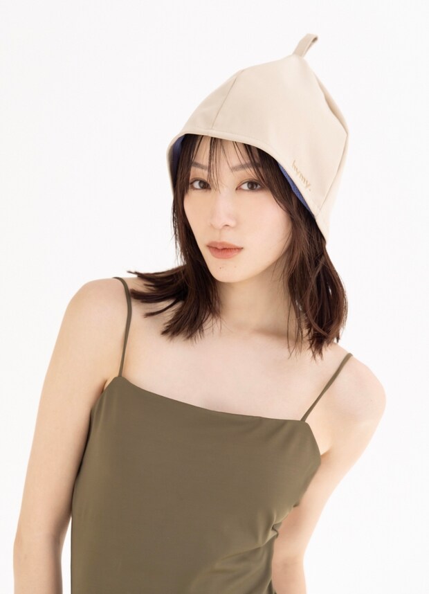 サウナハットとワンピースを着用した花山さん。サウナを知り尽くした彼女ならではのアイデアがたくさん盛り込まれた、こだわりのコラボアイテムが揃います。サウナハット※メッシュバッグとセット¥11,000、スイムウェア¥17,600(共にMIZUKI HANAYAMA×NAVE)