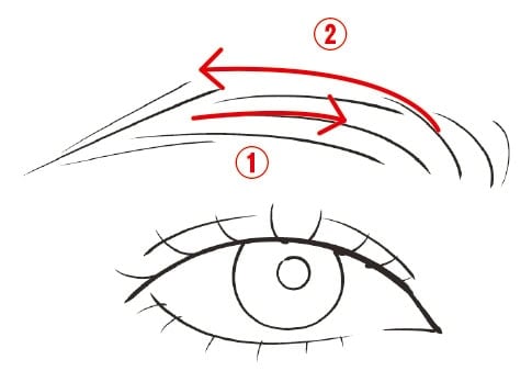 最初に眉尻の下など、足りない部分だけを手持ちのブラウンペンシルで描き足しておく(びっしり描かないように!)。その後アイブロウマスカラを。まず毛を逆立てるように根元から塗ったら、毛流れに沿って塗り整える。