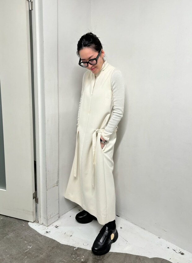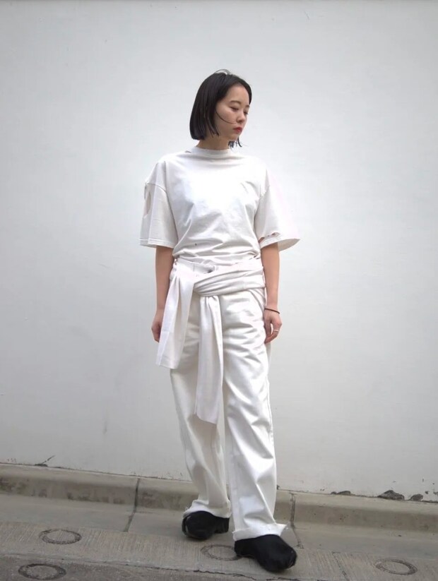 ぽってりとボリュームのあるシューズが今季らしさ満点。足元以外全てホワイトでまとめることでラフなスタイルをクリーンでモードな印象に。