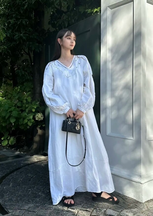 たっぷりと刺繍を施したコットンドレスは優しくロマンティックなムードながら、ブラックのミニバッグ、カジュアルなサンダルをプラスすることでモダンなバランスに昇華。