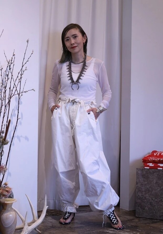 ボリュームたっぷりのメンズライクなミリタリーパンツとレディなシアートップスのコントラストが◎。存在感のあるシューズやジュエリーで“らしさ”を主張。