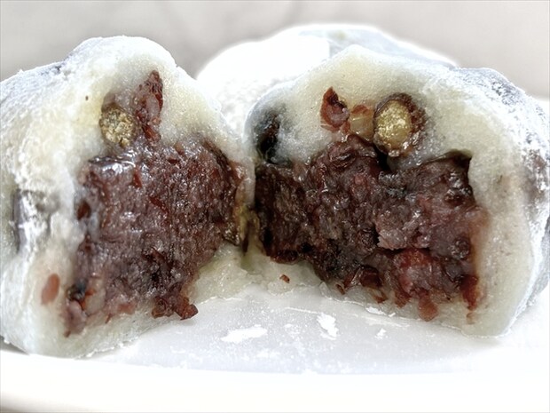 なかには、北海道産小豆を使用した粒あんがぎっしり。赤えんどうかのこ豆にはほどよく塩味がきいており、粒あんの甘みと絶妙にマッチ。甘じょっぱさがたまりません。