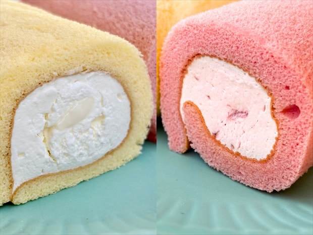 いちご味のロールケーキにはいちごジャム入り。ミルクロールケーキには練乳ソースが入っています。