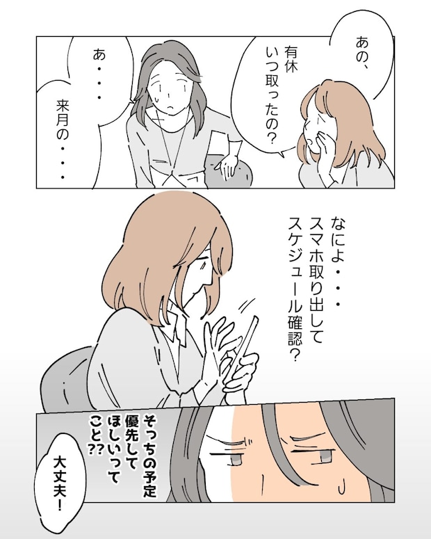 よろよろと椅子に腰を下ろそうとしたそのとき、大宮さんが「あの、有休いつ取ったの?」と声をかけてきました。「あ・・・来月の」そう答えると、大宮さんはおもむろにスマホを取り出し、スケジュールを確認し始めます。もしかして自分の予定を優先してほしいってこと?私は怪訝な表情で大宮さんを見つめました。