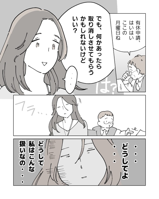 翌日、私は上司に有休を申請しました。申請書に目を落とした上司は、さも当然といった口調で「はいはいここの月曜日ね、でも何かあったら取り消しさせてもらうかもしれないけどいい?」と言います。どうしてよ・・・どうして私はこんな扱いなの・・・。私は身体をふらつかせながら、自分のデスクに戻りました。