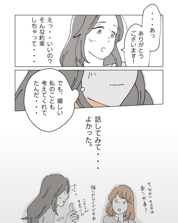 「あっ、ありがとうございます!」急にそんな約束をしてしまって、子どものことは大丈夫なんでしょうか。でも、他の社員は私がワーママさんの仕事をカバーしたり、有休を調整することが当たり前だと思っているなか、大宮さんだけは私のことを考えてくれた・・・。勇気を出して話してみてよかったです。