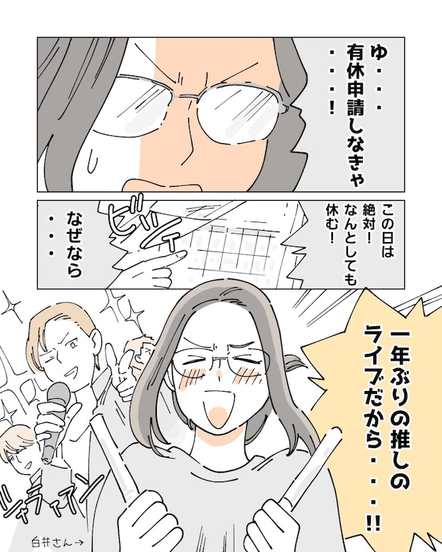 そんなある日、推しのライブが1年ぶりに開催されることが決まりました。公演数も少なく、開催地も限られている・・・だからこそこの機会は絶対に逃したくありません!そのためには、何としても有休を取る必要があります。