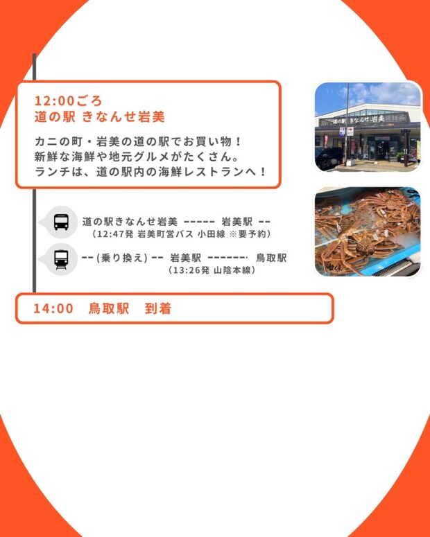 ※買い物と食事もじっくり楽しみたい方は14:06発の道の駅きなんせ岩美→岩美駅バスに乗車