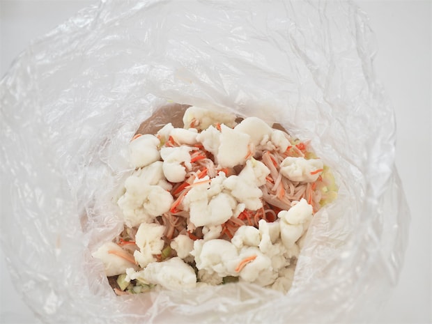 2. ポリ袋に1、[A]、ほぐしたカニ風味かまぼこ、袋の中で崩したはんぺんを加えて揉んで混ぜ合わせる。袋の端を2cmほど切っておく。